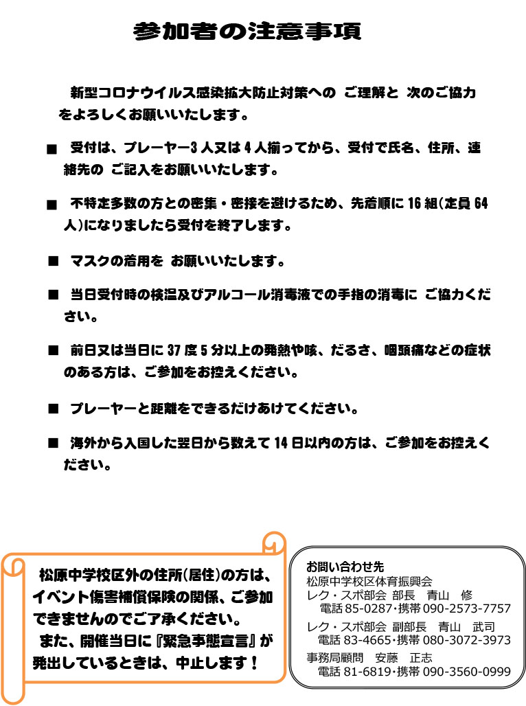| 募集人員 | 80名 松原中学校区在住者及び在住関係者 ※先着80名様を優先させていただきます。 |